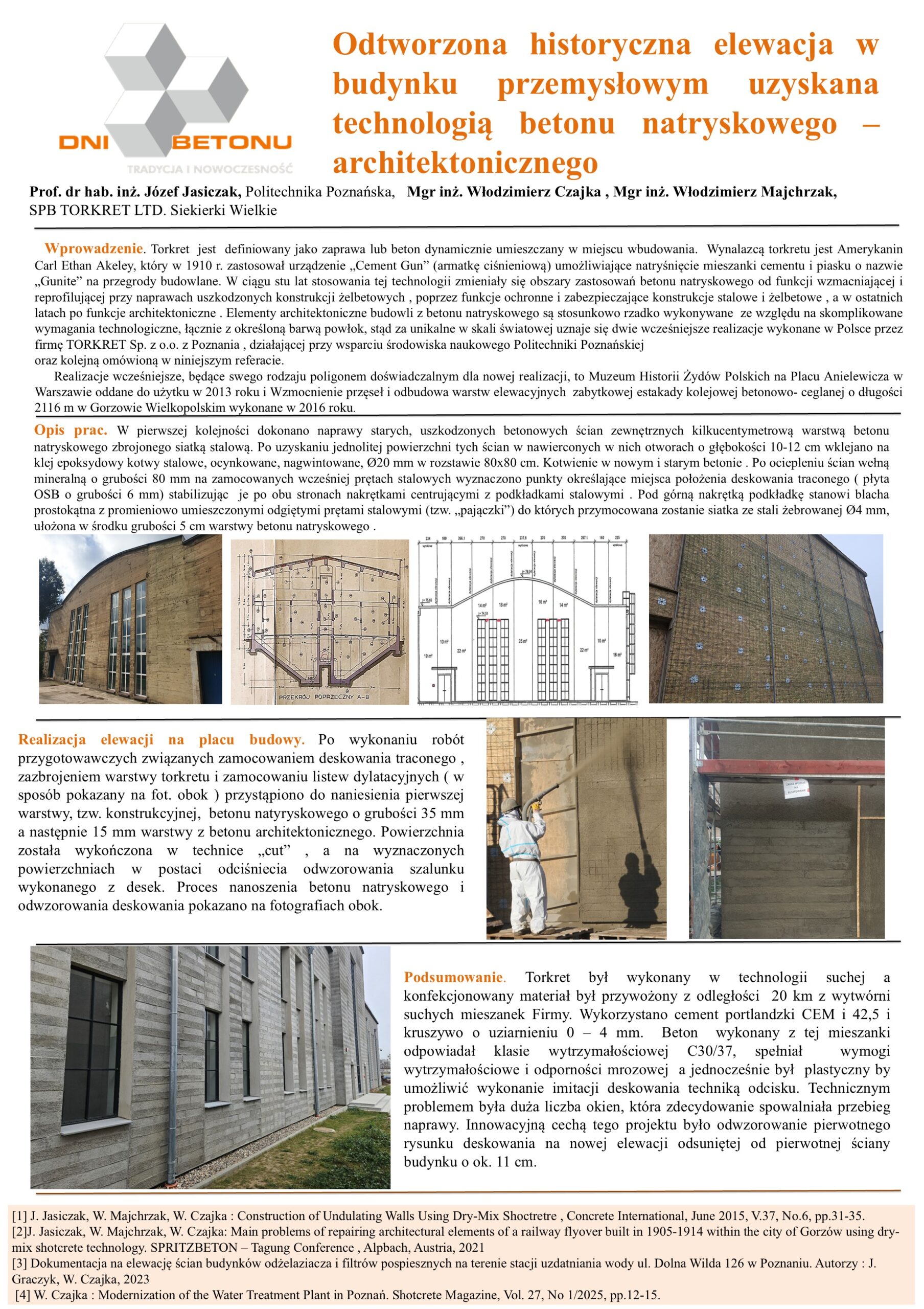 | 1 | Józef Jasiczak – Politechnika Poznańska, Włodzimierz Czajka, Włodzimierz Majchrzak – SPB TORKRET LTD | Odtworzona historyczna elewacja w budynku przemysłowym uzyskana technologią betonu natryskowego – architektonicznego | | Streszczenie | Poster | |