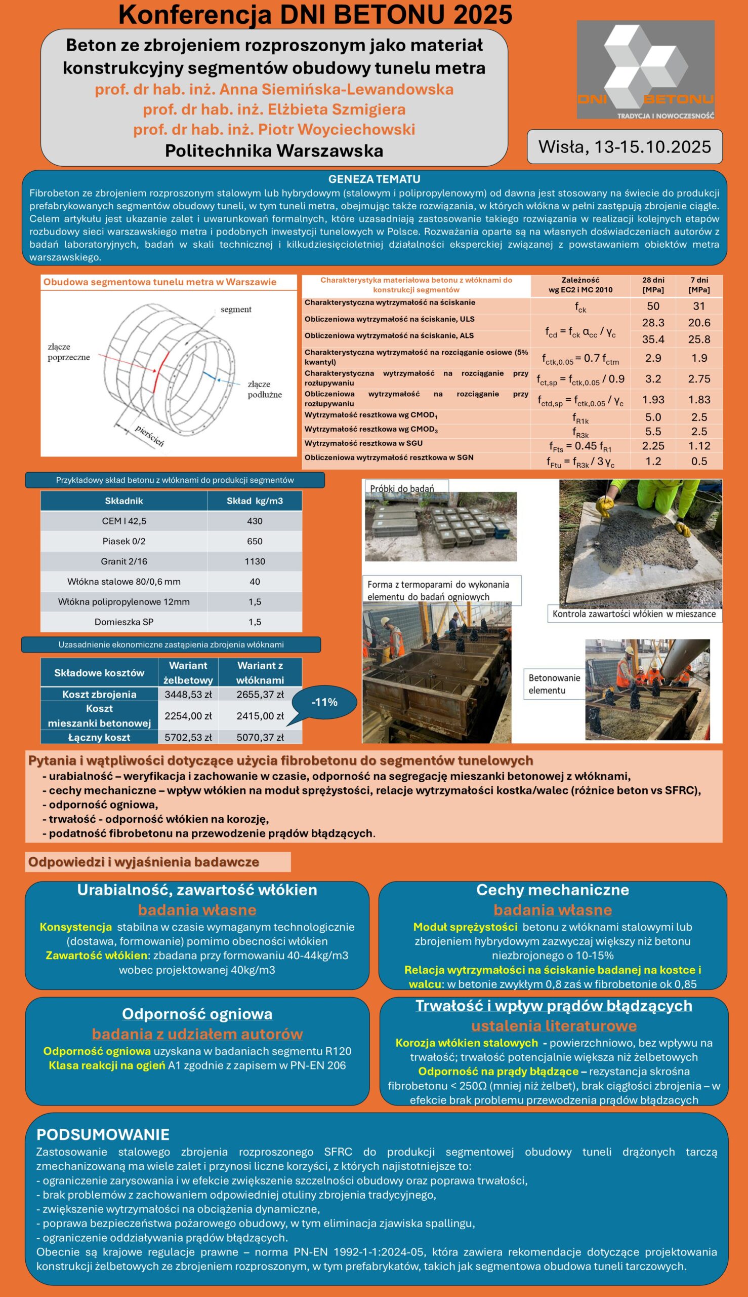 | 2 | Anna Siemińska-Lewandowska, Elżbieta Szmigiera, Piotr Woyciechowski – Politechnika Warszawska | Beton ze zbrojeniem rozproszonym jako materiał konstrukcyjny segmentów obudowy tunelu metra | | Streszczenie | Poster | |