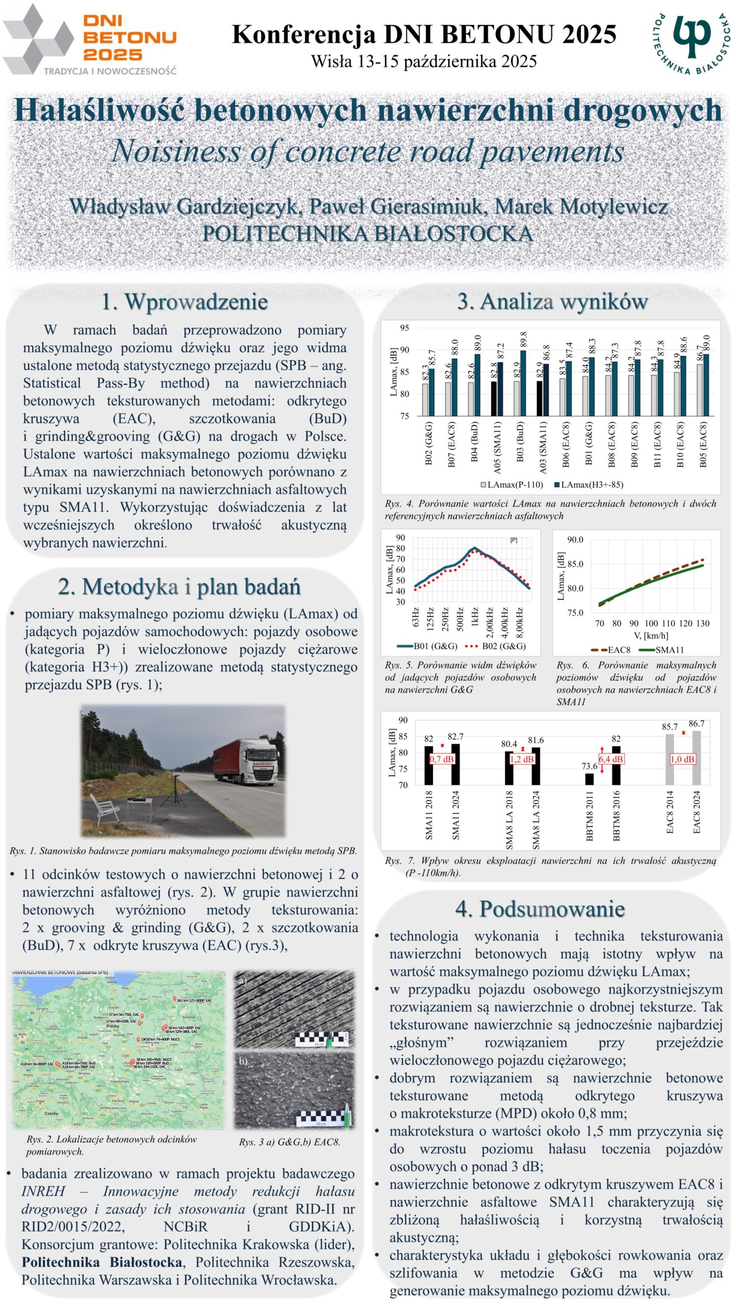 | 4 | Władysław Gardziejczyk, Paweł Gierasimiuk, Marek Motylewicz – Politechnika Białostocka | Hałaśliwość betonowych nawierzchni drogowych | | Streszczenie | | Poster | |