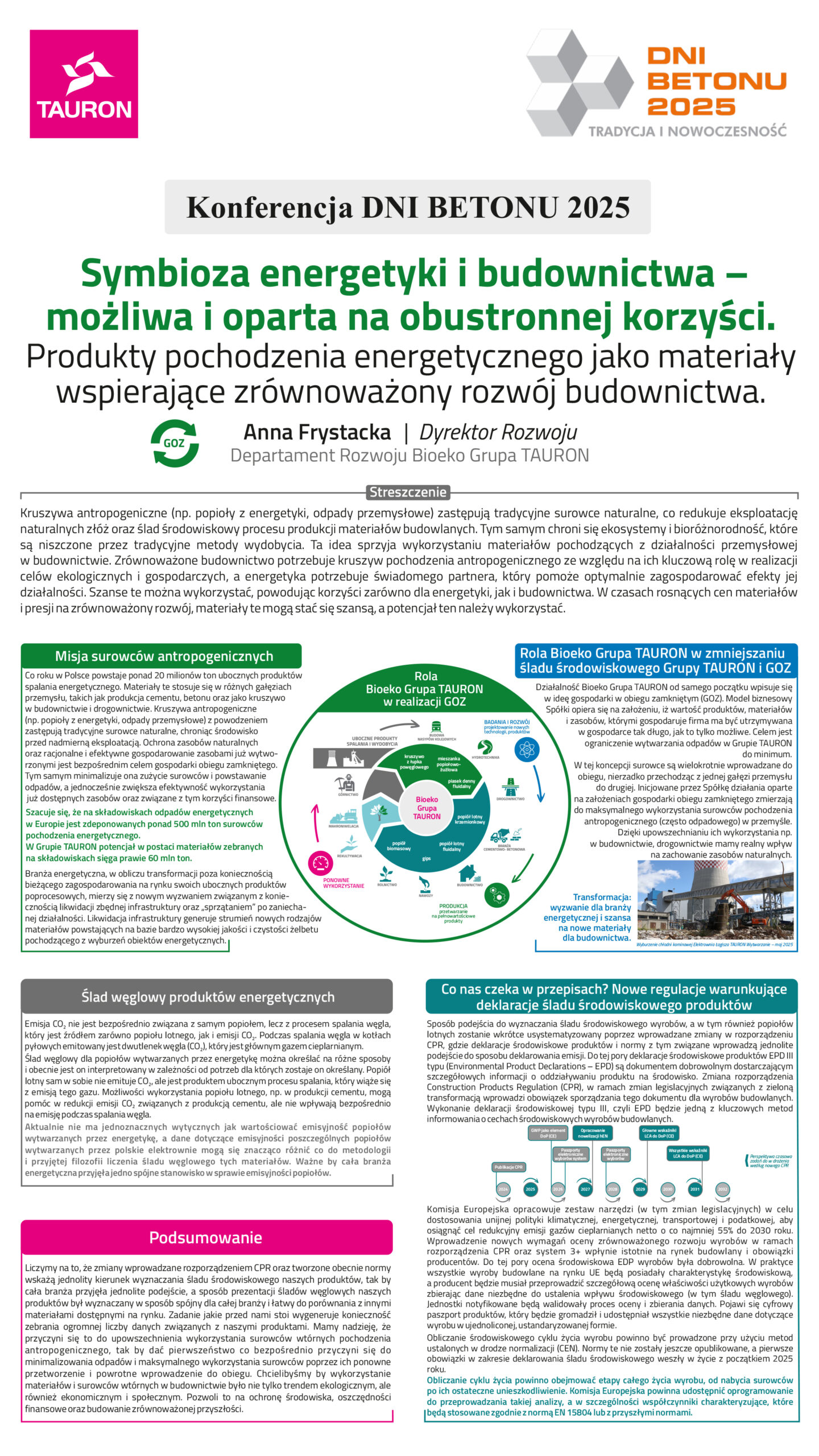| 5 | Anna Frystacka – Bioeko Grupa Tauron | Symbioza energetyki i budownictwa – możliwa i oparta na obustronnej korzyści. Produkty pochodzenia energetycznego jako materiały wspierające zrównoważony rozwój budownictwa | | Streszczenie | Poster | |