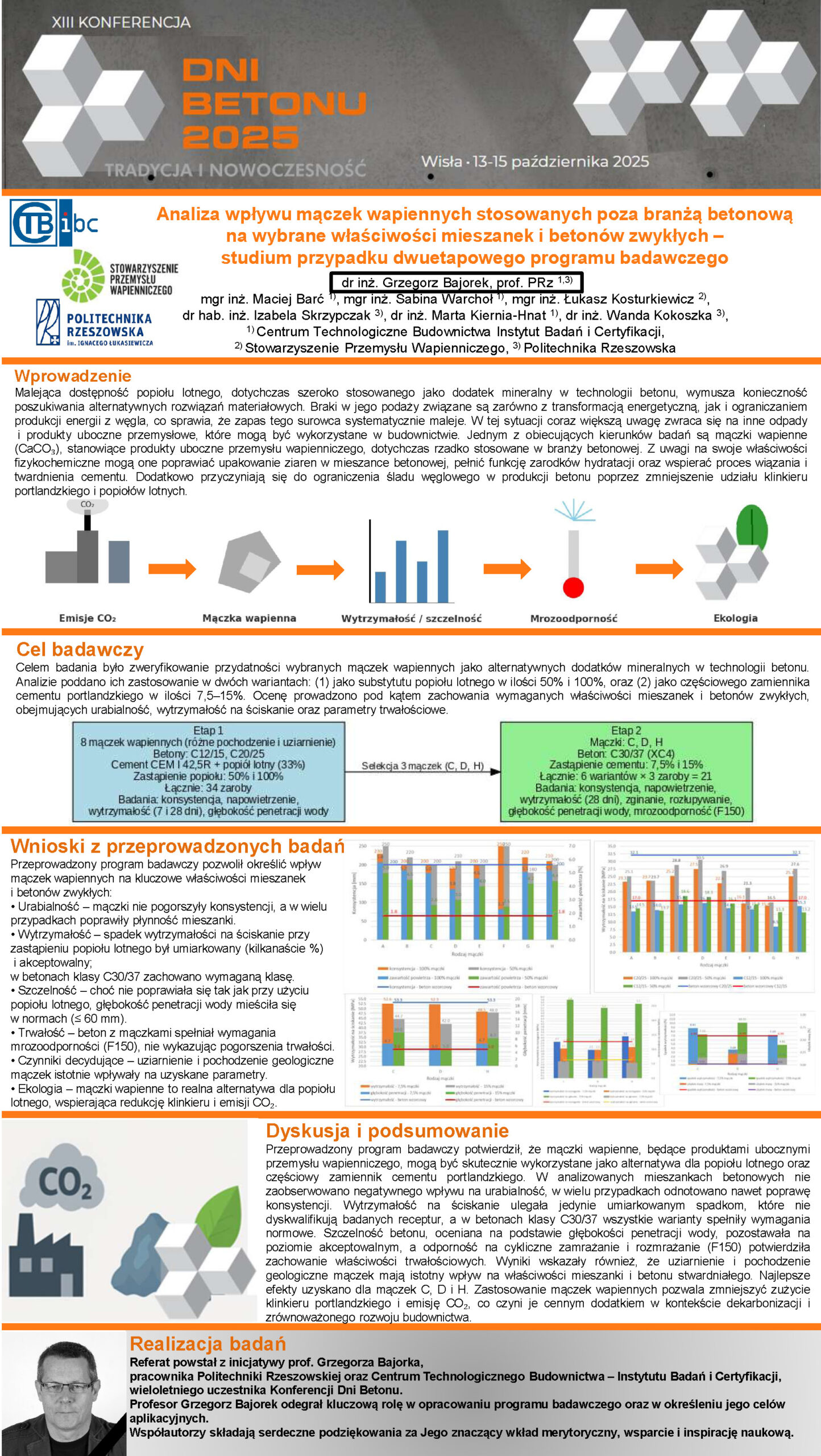 | 8 | Grzegorz Bajorek, Maciej Barć, Sabina Warchoł, Marta Kiernia-Hnat – CTB IBiC, Łukasz Kosturkiewicz – Stowarzyszenie Przemysłu Wapienniczego, Izabela Skrzypczak, Wanda Kokoszka – Politechnika Rzeszowska | Analiza wpływu mączek wapiennych stosowanych poza branżą betonową na wybrane właściwości mieszanek i betonów zwykłych – studium przypadku | | Streszczenie | Poster | |
