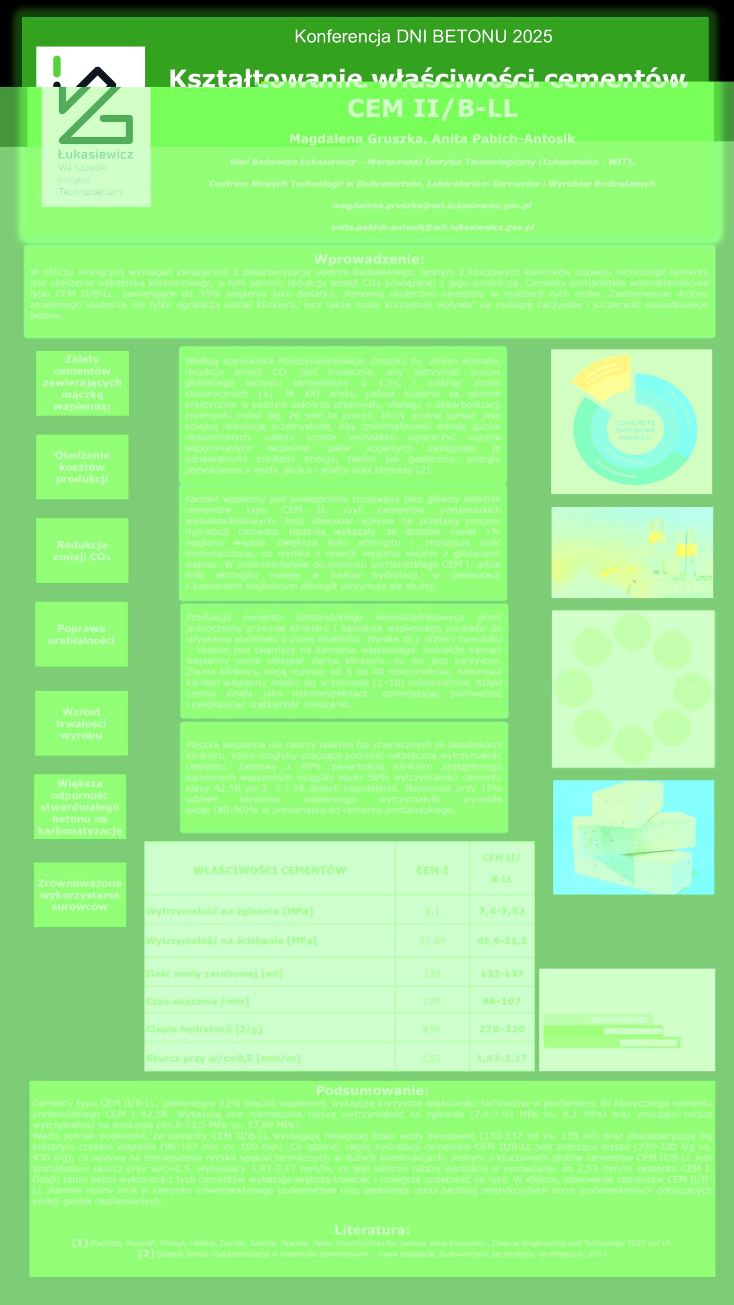 | 10 | Magdalena Gruszka, Anita Pabich-Antosik – Sieć Badawcza Łukasiewicz – Warszawski Instytut Technologiczny | Kształtowanie właściwości cementów CEM II/B-LL | | Streszczenie | Poster | |