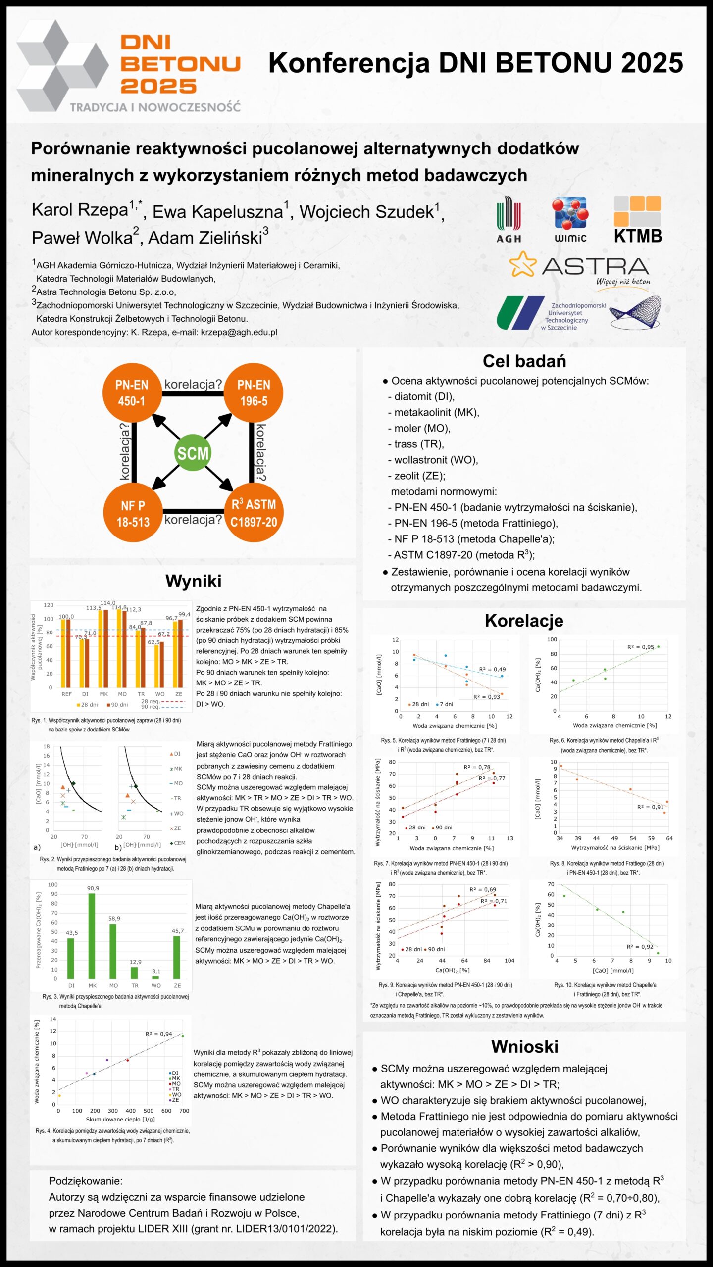 | 13 | Karol Rzepa, Wojciech Szudek, Ewa Kapeluszna, AGH w Krakowie, Paweł Wolka – Astra Technologia Betonu Sp z.o.o., Adam Zieliński – Zachodniopomorski UT w Szczecinie | Porównanie reaktywności pucolanowej alternatywnych dodatków mineralnych z wykorzystaniem różnych metod badawczych | | Streszczenie | Poster | |