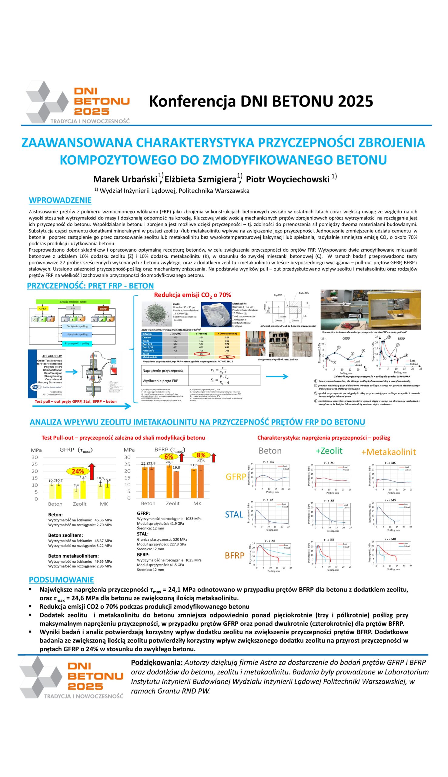 | 14 | Marek Urbański, Elżbieta Szmigiera, Piotr Woyciechowski, Wydział Inżynierii Lądowej, PW | Zaawansowana charakterystyka przyczepności zbrojenia kompozytowego do zmodyfikowanego betonu | | Streszczenie | Poster | |