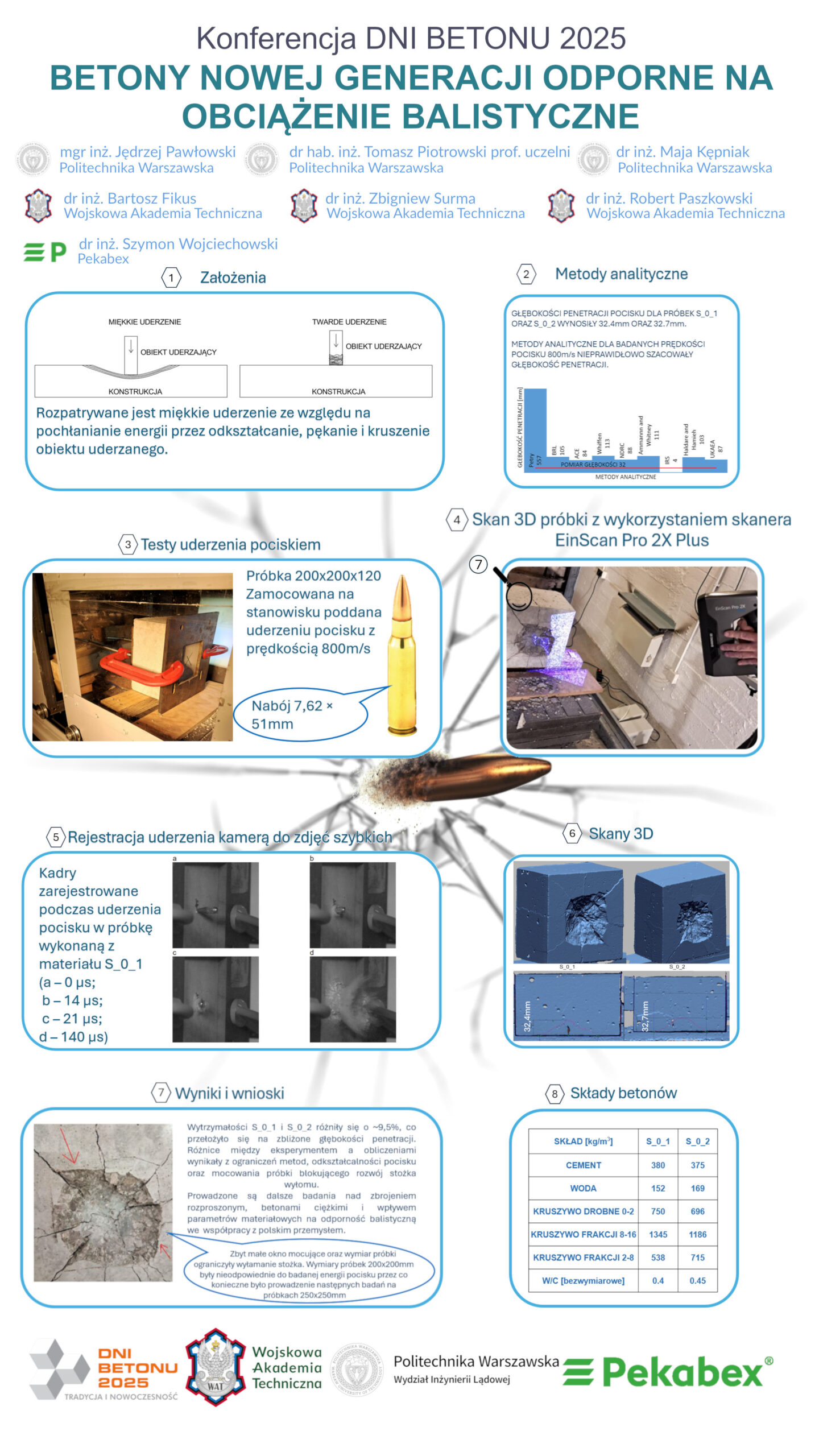 | 16 | Jędrzej Pawłowski, Tomasz Piotrowski, Maja Kępniak – Politechnika Warszawska, Bartosz Fikus, Zbigniew Surma, Robert Paszkowski – Wojskowa Akademia Techniczna, Szymon Wojciechowski – Pekabex | Betony nowej generacji odporne na obciążenie balistyczne | | Streszczenie | Poster | |