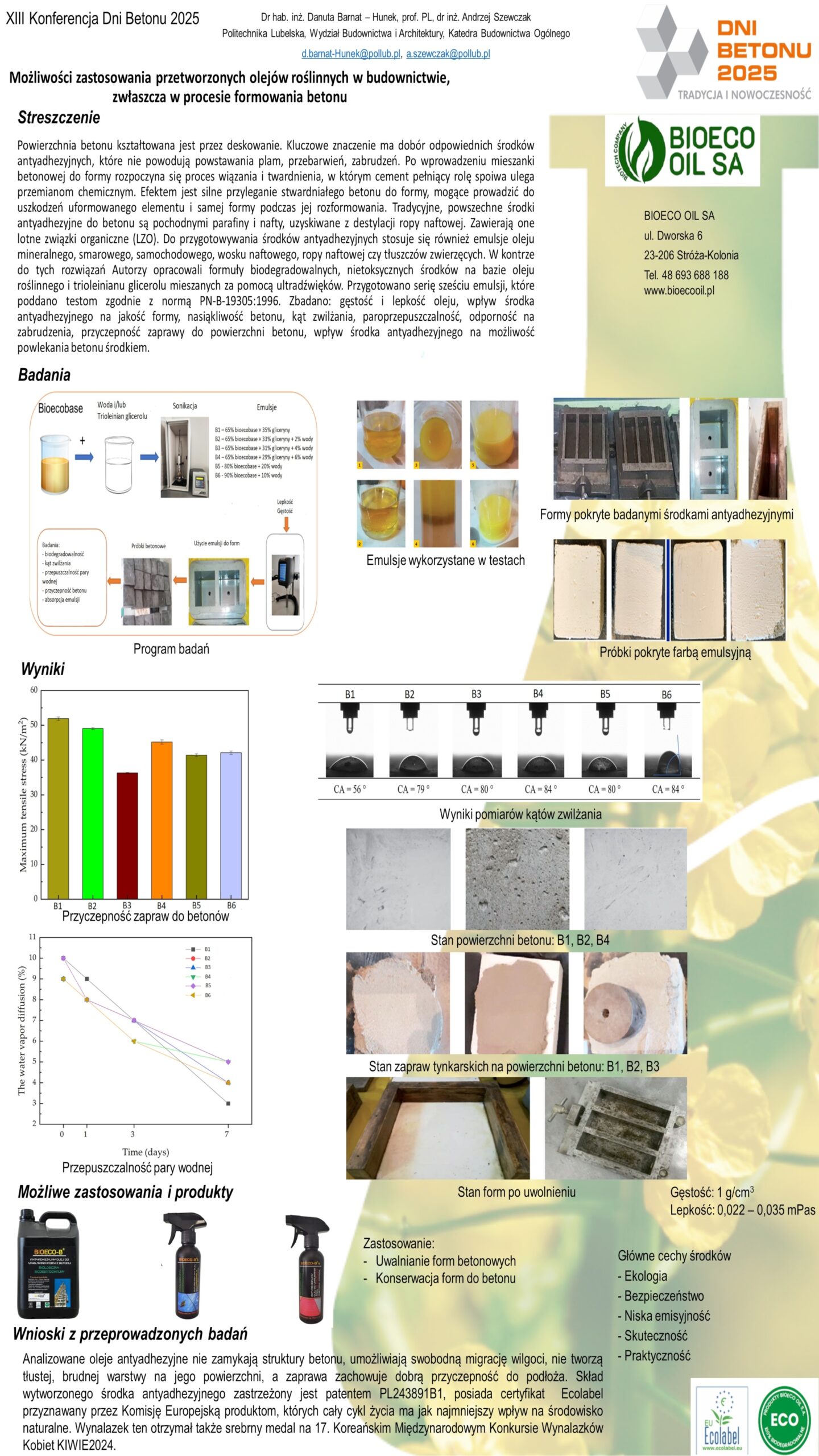 | 20 | Danuta Barnat-Hunek, Andrzej Szewczak – Politechnika Lubelska | Możliwości zastosowania przetworzonych olejów roślinnych w budownictwie, zwłaszcza w procesie formowania betonu | | Streszczenie | Poster | |