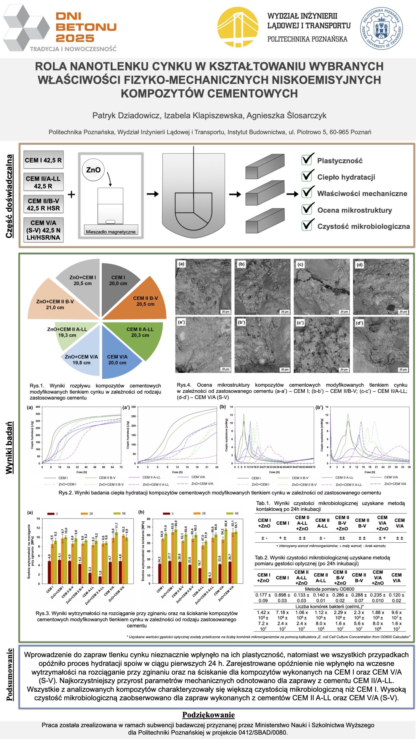 | 21 | Patryk Dziadowicz, Izabela Klapiszewska, Agnieszka Ślosarczyk – Politechnika Poznańska | Rola nanotlenku cynku w kształtowaniu wybranych właściwości fizyko-mechanicznych niskoemisyjnych kompozytów cementowych | | Streszczenie | Poster | |