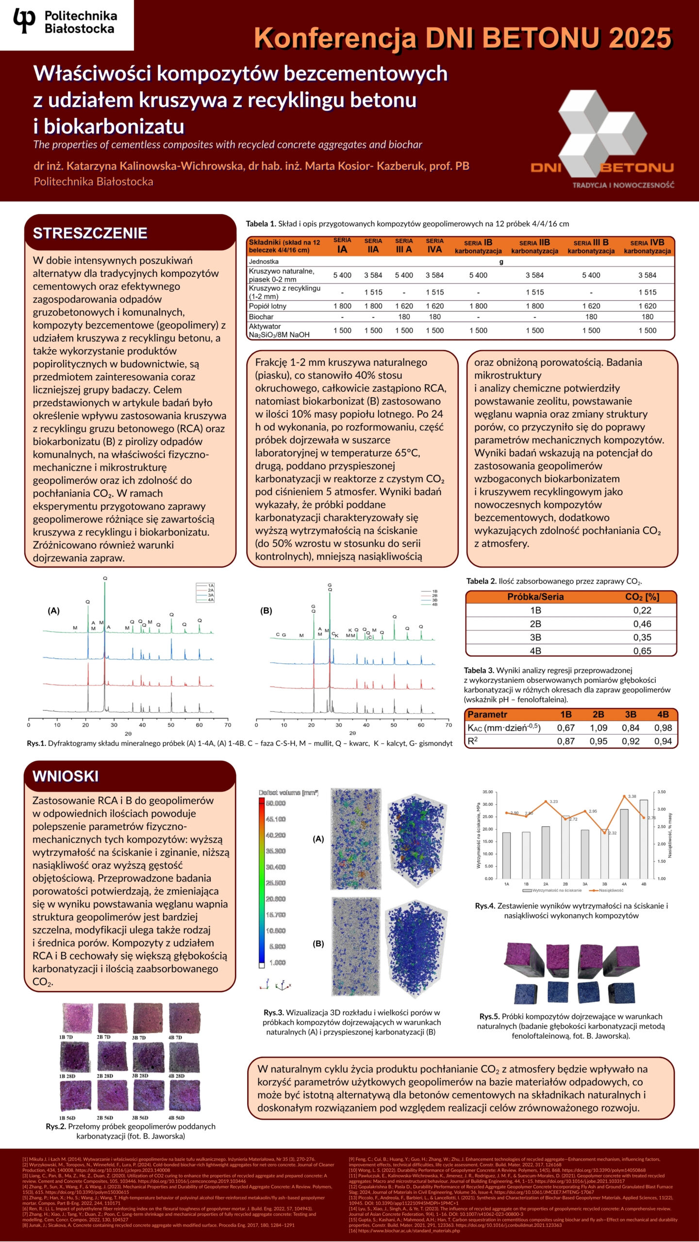 | 22 | Katarzyna Kalinowska-Wichrowska, Marta Kosior- Kazberuk – Politechnika Białostocka | Właściwości kompozytów bezcementowych z udziałem kruszywa z recyklingu betonu i biokarbonizatu | | Streszczenie | Poster | |
