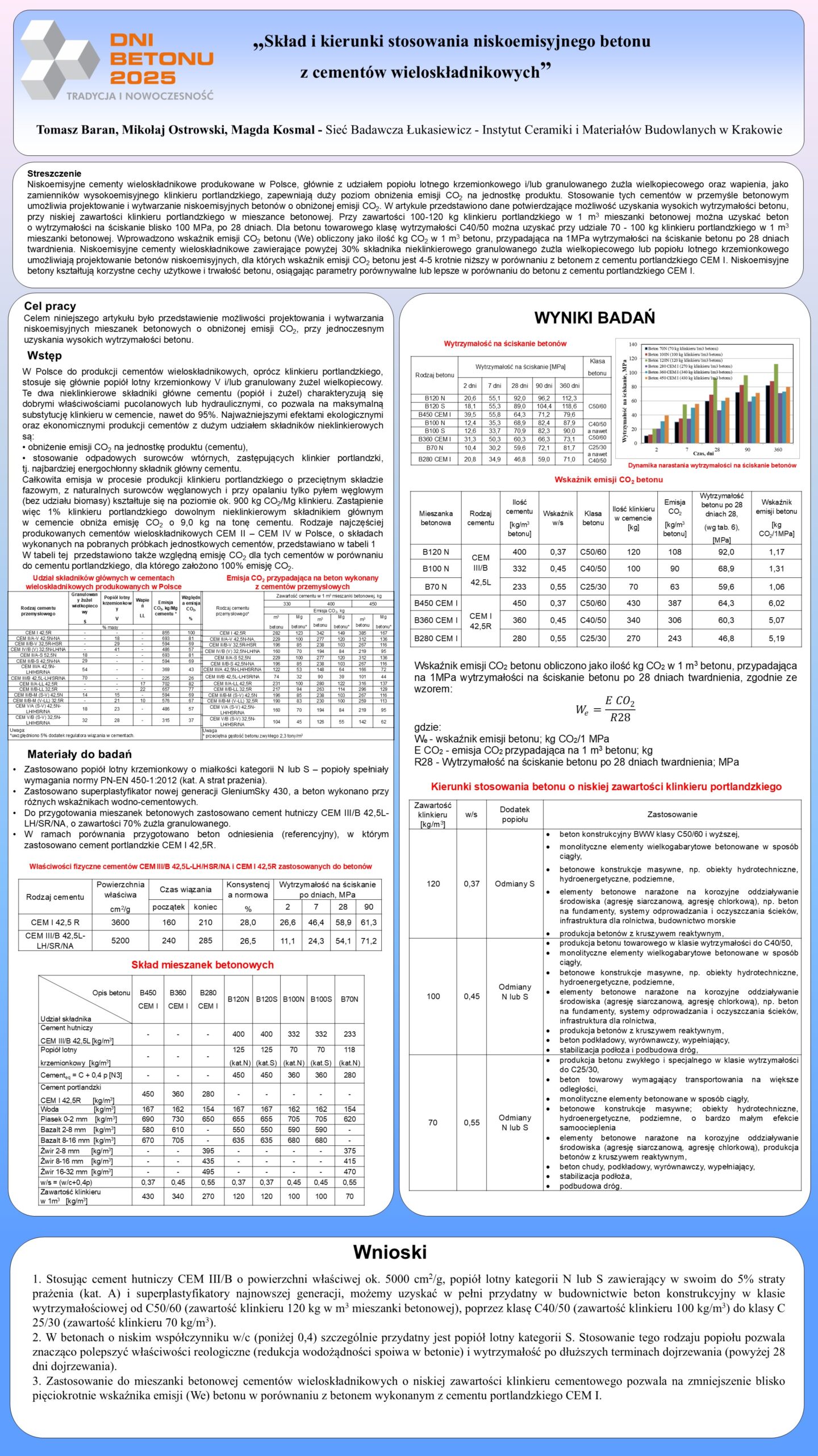 | 23 | Tomasz Baran, Mikołaj Ostrowski, Magda Kosmal – Sieć Badawcza Łukasiewicz – ICiMB w Krakowie | Skład i kierunki stosowania niskoemisyjnego betonu z cementów wieloskładnikowych | | Streszczenie | Poster | |