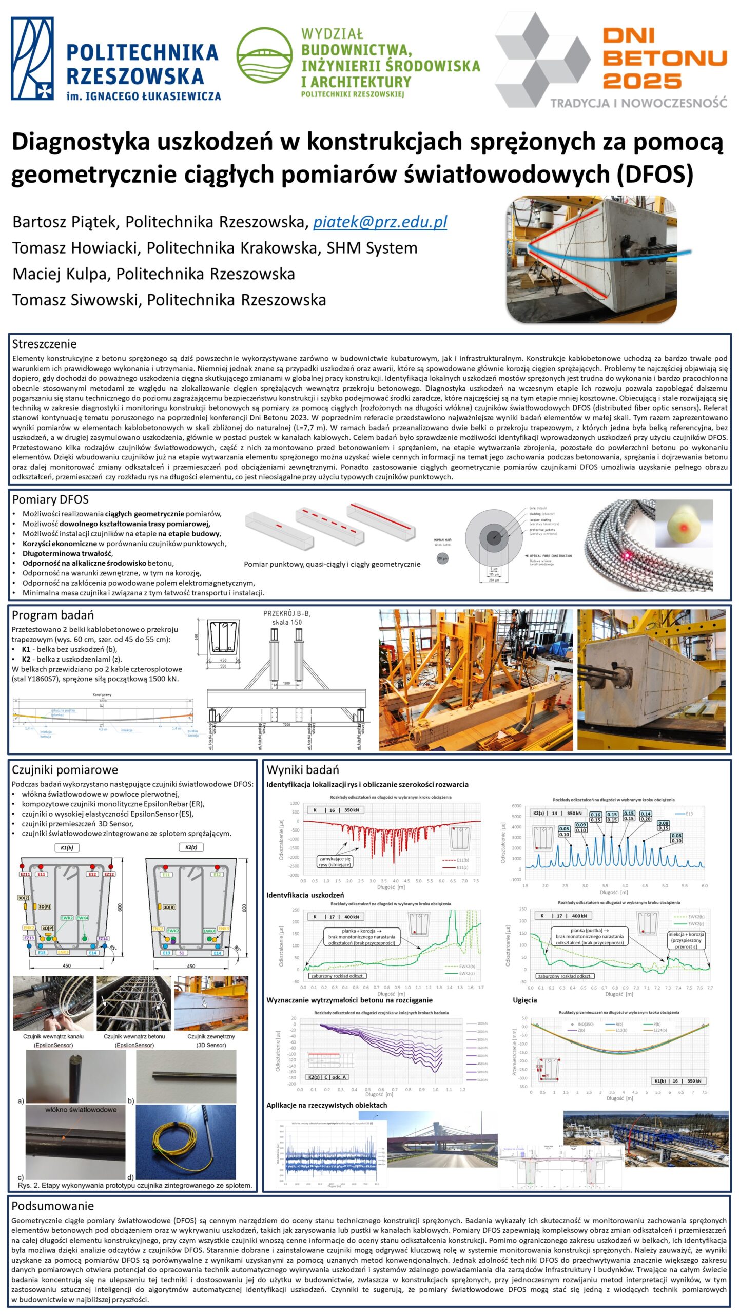 | 24 | Bartosz Piątek, Maciej Kulpa, Tomasz Siwowski – Politechnika Rzeszowska, Tomasz Howiacki – Politechnika Krakowska | Diagnostyka uszkodzeń w konstrukcjach sprężonych za pomocą geometrycznie ciągłych pomiarów światłowodowych (DFOS) | | Streszczenie | Poster | |