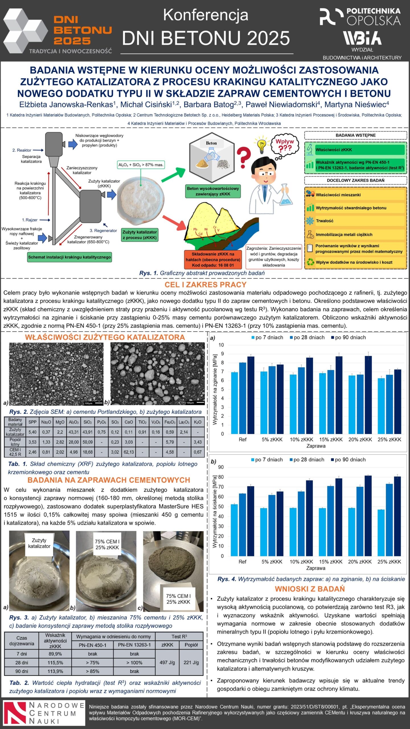 | 25 | Elżbieta Janowska-Renkas – Politechnika Opolska, Michał Cisiński, Barbara Batog, Politechnika Opolska; Centrum Technologiczne Betotech Sp. z o.o., Paweł Niewiadomski, Martyna Nieświec – Politechnika Wrocławska | Badania wstępne w kierunku oceny możliwości zastosowania zużytego katalizatora z procesu krakingu katalitycznego jako nowego dodatku typu II w składzie zapraw cementowych i betonu | | Streszczenie | Poster | |