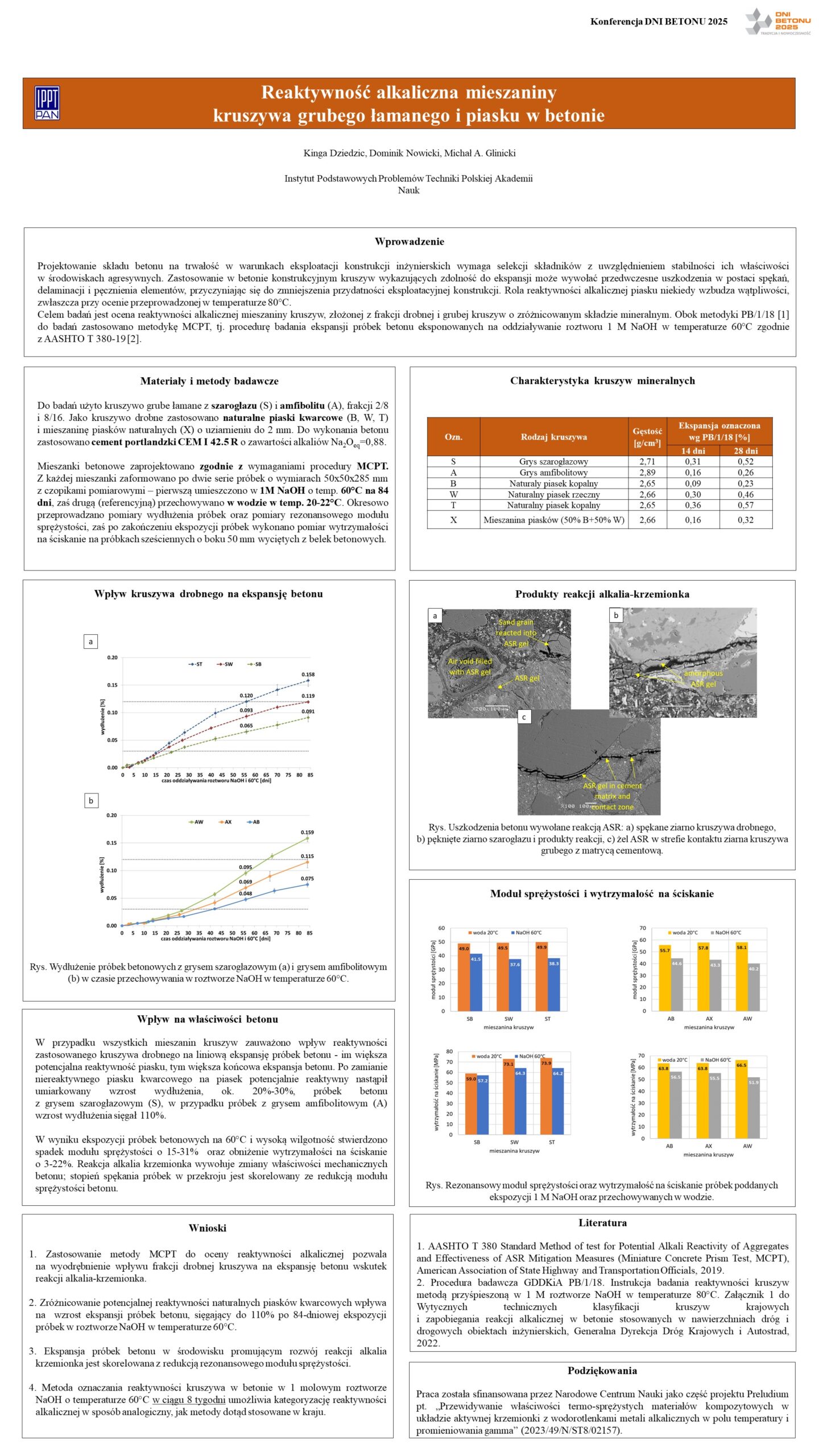 | 26 | Kinga Dziedzic, Dominik Nowicki, Michał A. Glinicki – IPPT PAN | Reaktywność alkaliczna mieszaniny kruszywa grubego łamanego i piasku w betonie | | Streszczenie | Poster | |