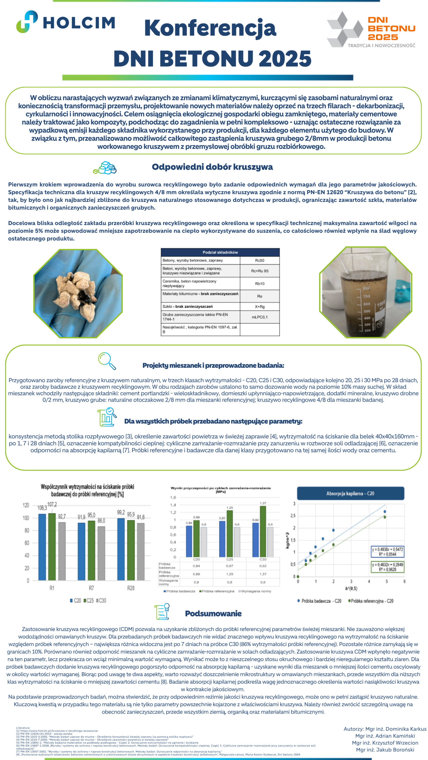 | 27 | Dominika Karkus, Adrian Kamiński, Krzysztof Wrzecion, Jakub Boroński – Holcim Polska | Realizowanie gospodarki obiegu zamkniętego z wykorzystaniem recyklingowego gruzu betonowego – CDM (construction demolition materials) w produktach chemii budowlanej z kruszywem do 8mm | | Streszczenie | Poster | |
