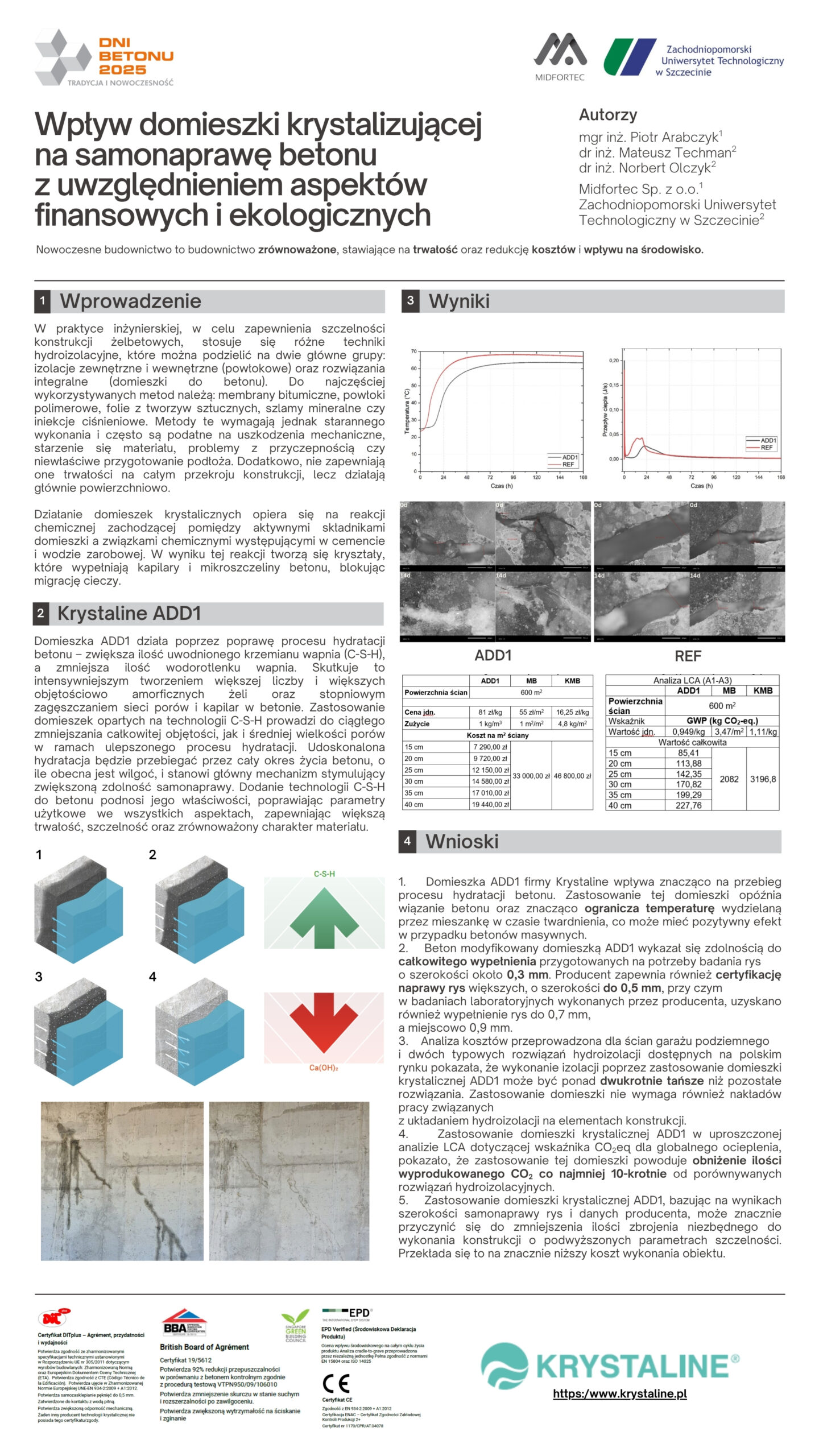 | 30 | Piotr Arabczyk Midfortec Sp. z o.o, Mateusz Techman – Zachodniopomorski UT w Szczecinie | Wpływ domieszki krystalizującej na samonaprawę betonu z uwzględnieniem aspektów finansowych i ekologicznych | | Streszczenie | Poster | |