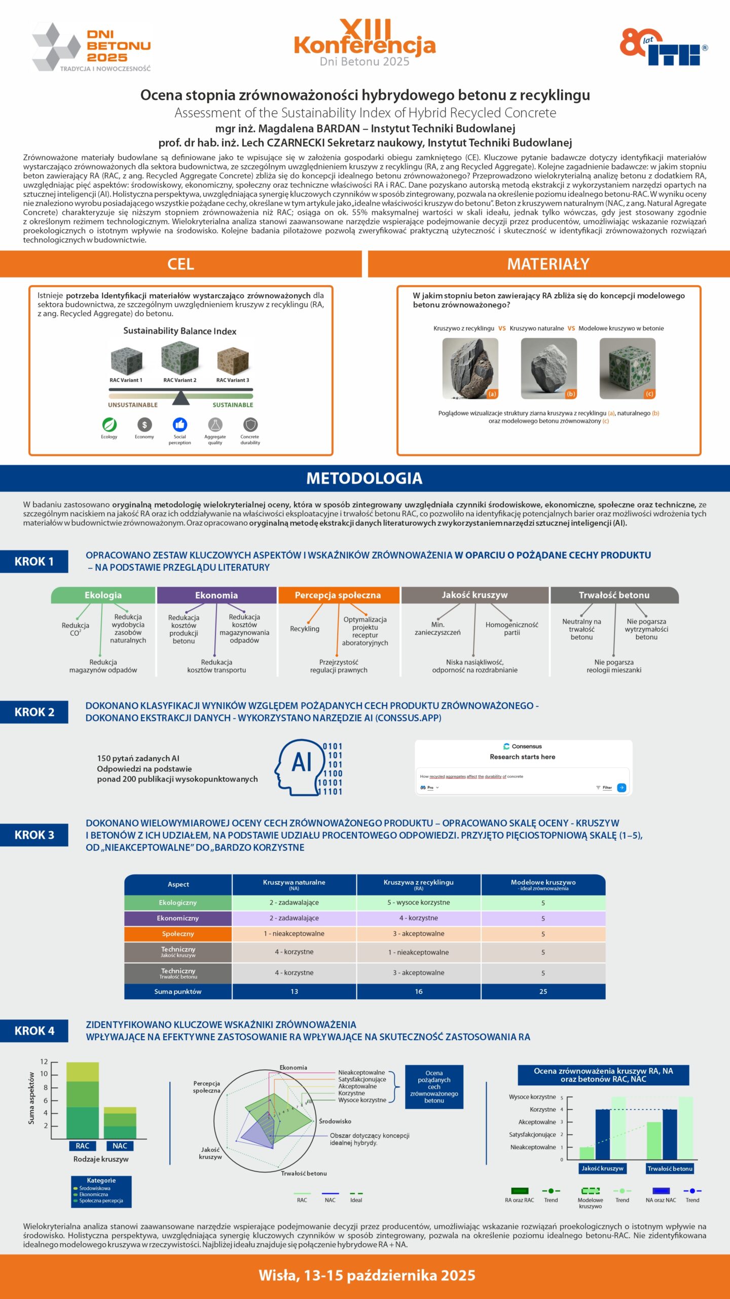 | 32 | Magdalena Bardan, Lech Czarnecki – Instytut Techniki Budowlanej | Ocena stopnia zrównoważoności hybrydowego betonu z recyklingu | | Streszczenie | Poster | |
