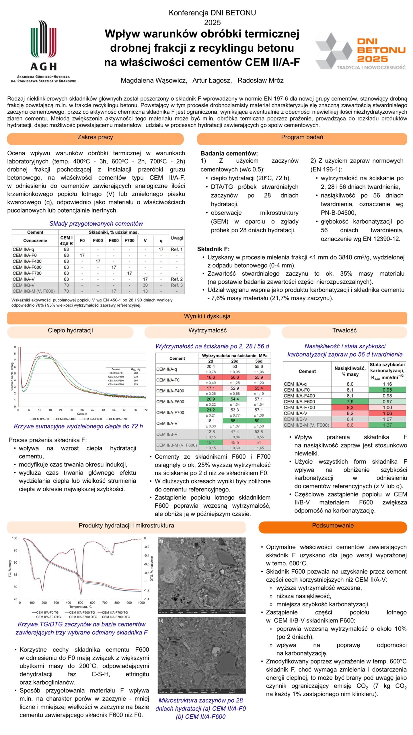 | 33 | Magdalena Wąsowicz, Artur Łagosz, Radosław Mróz – AGH w Krakowie | Wpływ warunków obróbki termicznej drobnej frakcji z recyklingu betonu na właściwości cementów CEM II/A-F | | Streszczenie | Poster | |
