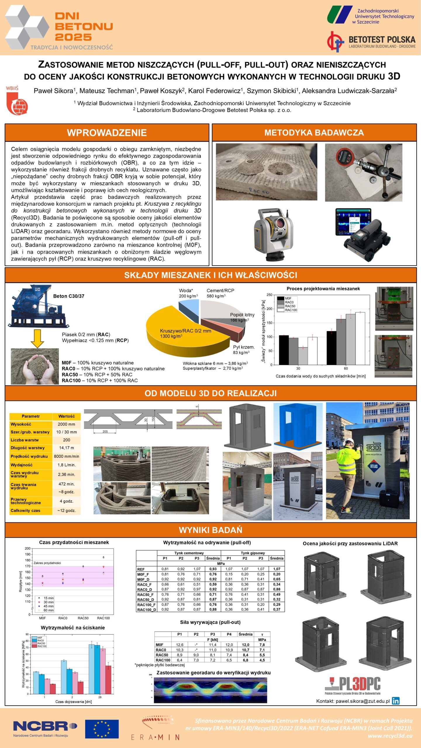 | 34 | Paweł Sikora, Mateusz Techman, Karol Federowicz, Szymon Skibicki – Zachodniopomorski UT w Szczecinie | Zastosowanie metod niszczących (pull-off, pull-out) oraz nieniszczących do oceny jakości konstrukcji betonowych wykonanych w technologii druku 3D | | Streszczenie | Poster | |