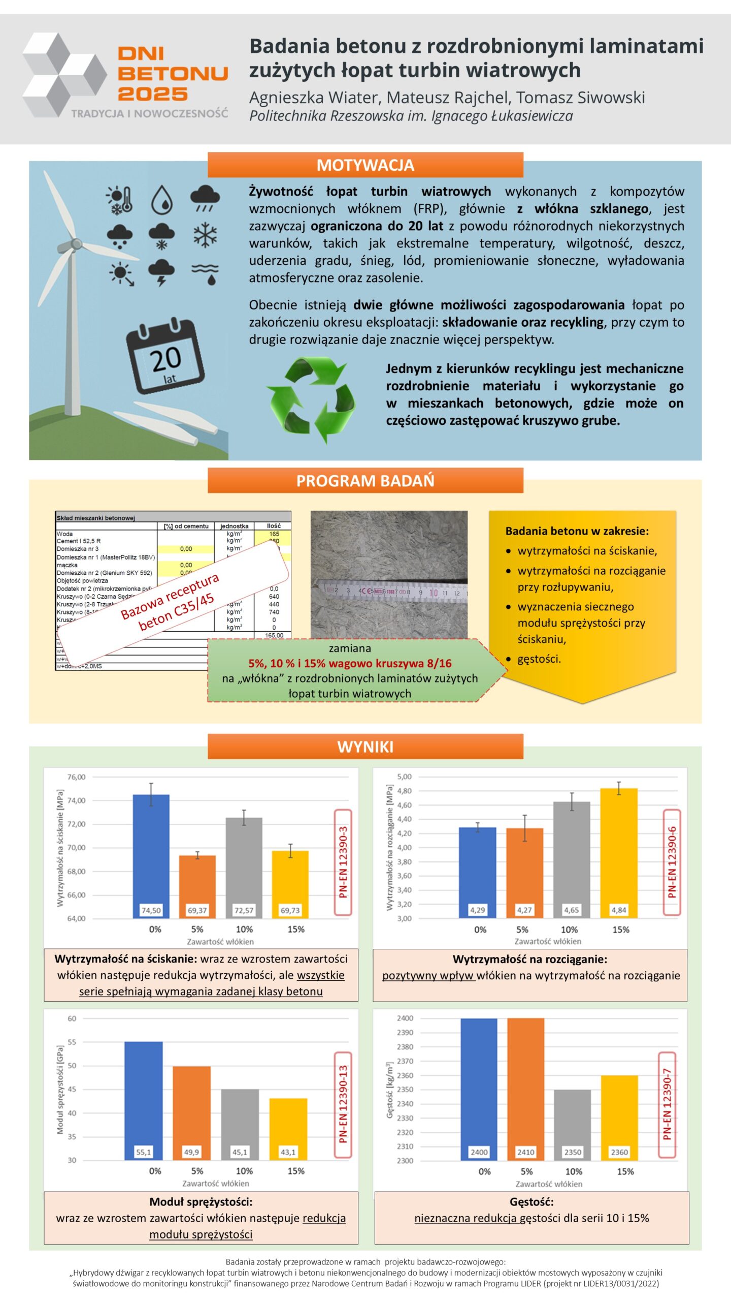 | 35 | Agnieszka Wiater, Mateusz Rajchel, Tomasz Siwowski – Politechnika Rzeszowska | Badania betonu z rozdrobnionymi laminatami zużytych łopat turbin wiatrowych | | Streszczenie | Poster | |