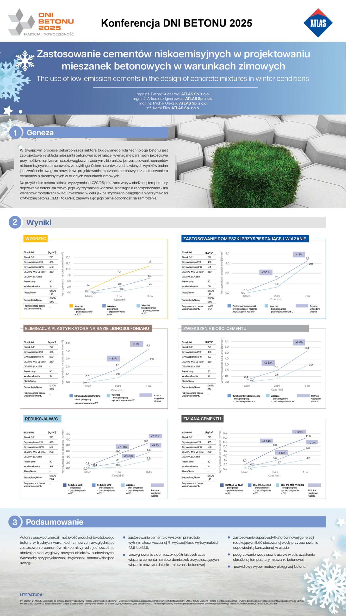 | 36 | Patryk Kucharski, Arkadiusz Ignerowicz, Michał Oleksik, Kamil Fiks – ATLAS Sp. z o.o. | Zastosowanie cementów niskoemisyjnych w projektowaniu mieszanek betonowych w warunkach zimowych | | Streszczenie | Poster | |
