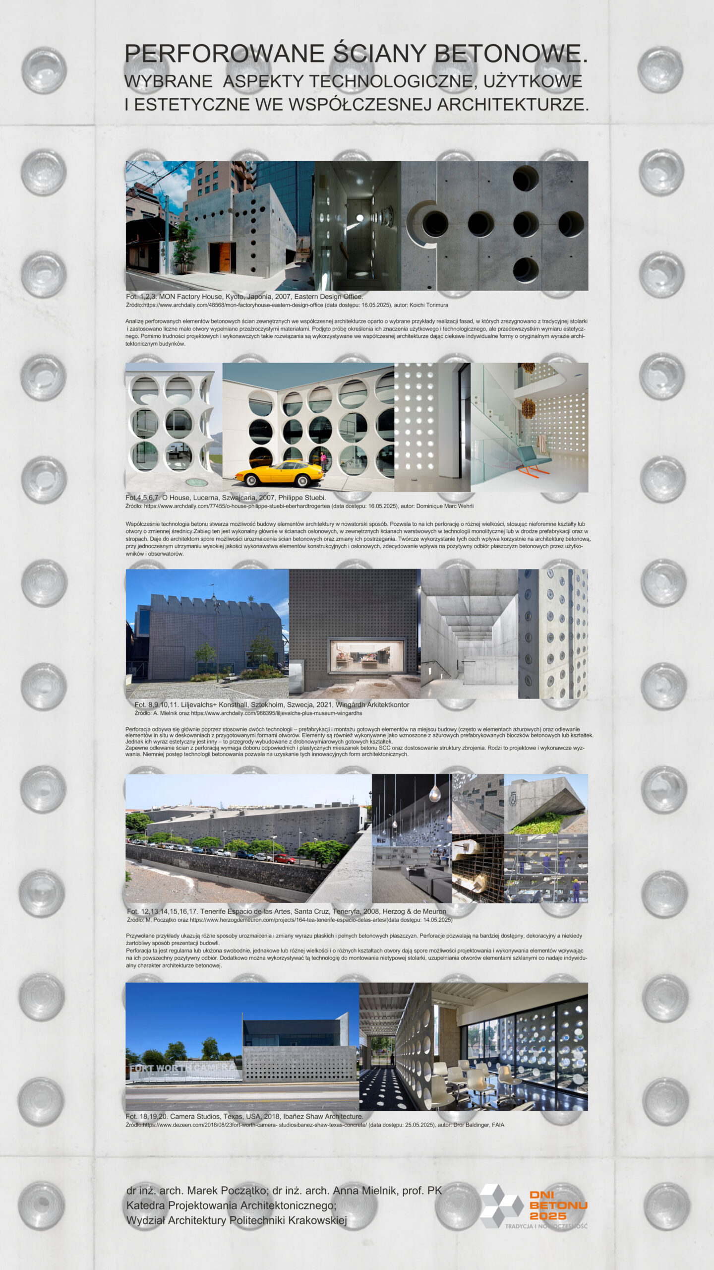 | 38 | Marek Początko, Anna Mielnik – Katedra Projektowania Architektonicznego; Wydział Architektury Politechniki Krakowskiej | „Perforowane ściany betonowe. Wybrane aspekty technologiczne, użytkowe i estetyczne we współczesnej architekturze” | | Streszczenie | Poster | |