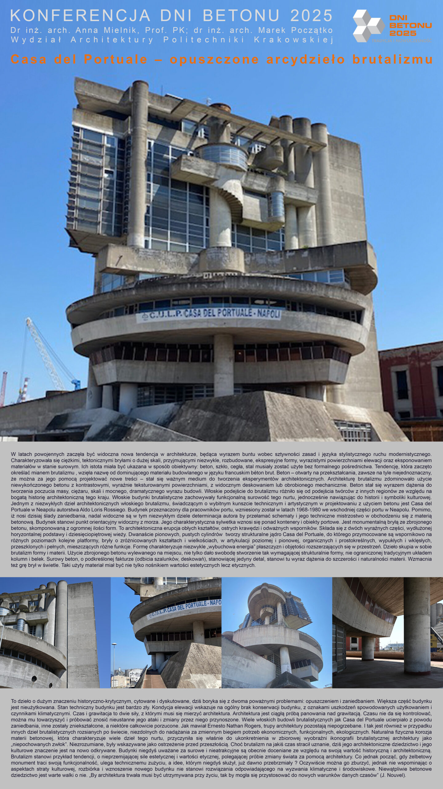 | 40 | Anna Mielnik, Marek Początko – Wydział Architektury Politechniki Krakowskiej | Casa del Portuale – opuszczone dzieło brutalizmu | | Streszczenie | Poster | |