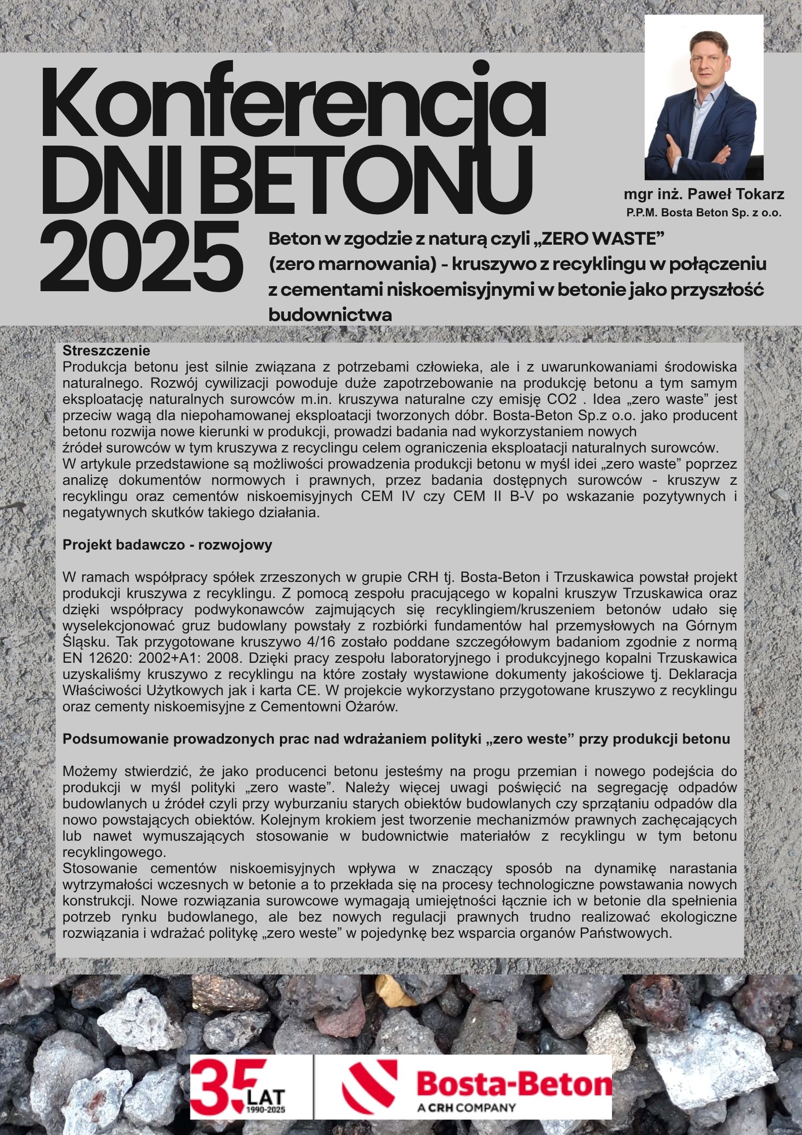 | 42 | Paweł Tokarz – Bosta Beton | Beton w zgodzie z naturą czyli „ZERO WASTE (zero marnowania) – kruszywo z recyklingu w połączeniu z cementami niskoemisyjnymi w betonie jako przyszłość budownictwa | | Streszczenie | Poster | |