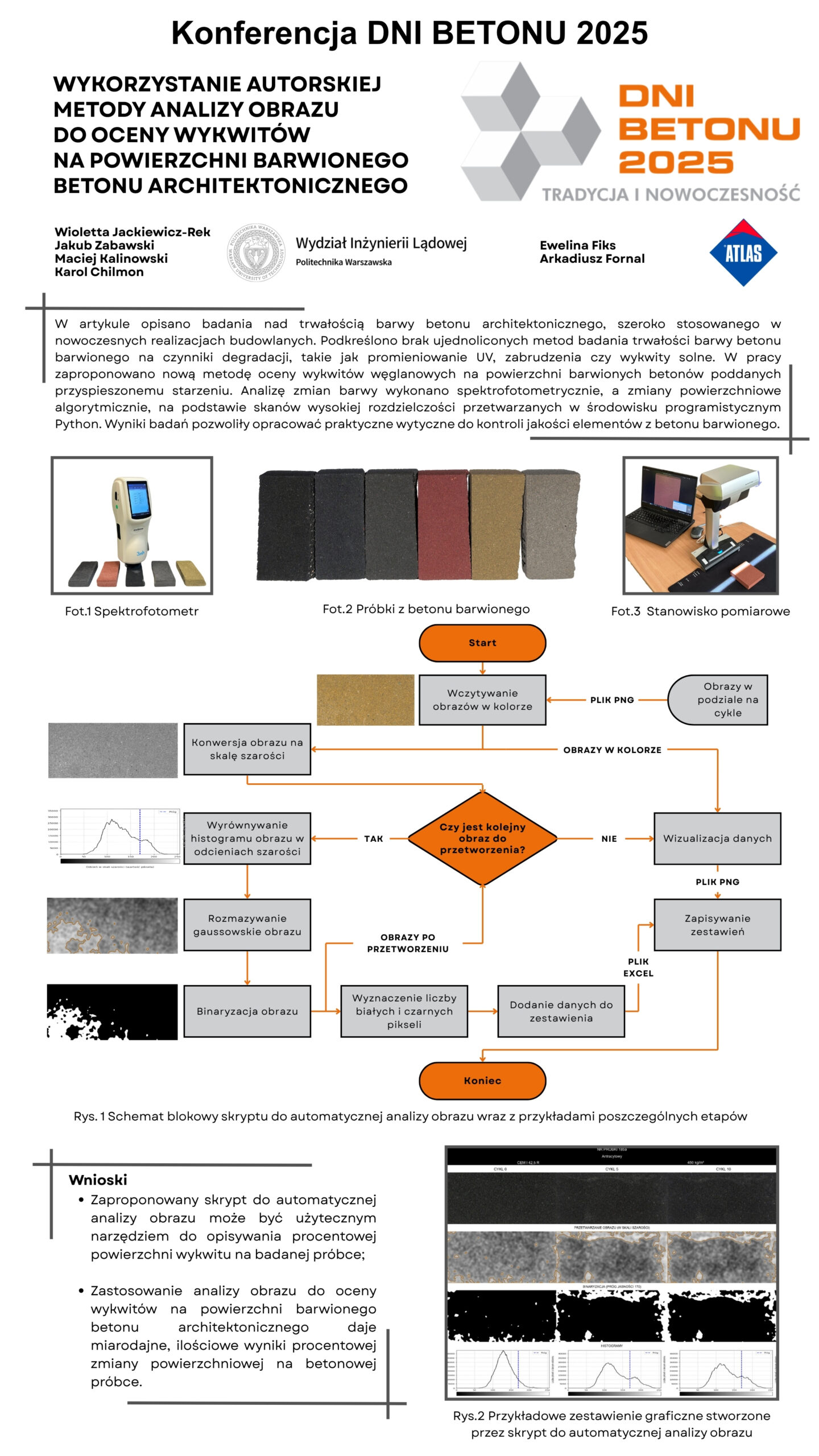 | 44 | Wioletta Jackiewicz-Rek, Jakub Zabawski, Maciej Kalinowski, Karol Chilmon – Politechnika Warszawska, Ewelina Fiks, Arkadiusz Fornal – ATLAS | Wykorzystanie autorskiej metody analizy obrazu do oceny wykwitów na powierzchni barwionego betonu architektonicznego | | Streszczenie | Poster | |