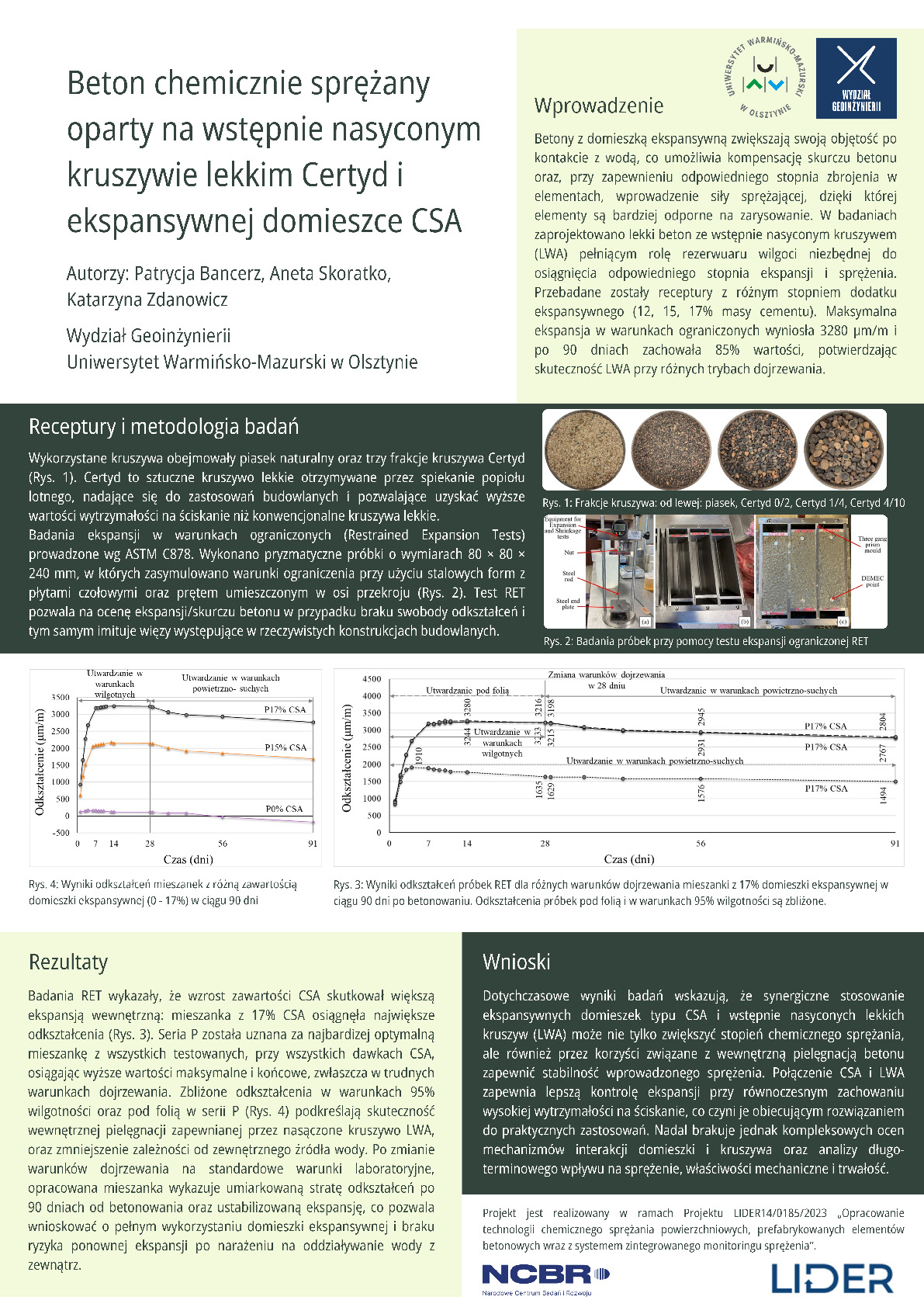 | 47 | Patrycja Bancerz, Aneta Skoratko, Katarzyna Zdanowicz – Wydział Geoinżynierii, Uniwersytet Warmińsko-Mazurski w Olsztynie | Beton chemicznie sprężany oparty na wstępnie nasyconym kruszywie lekkim Certyd i ekspansywnej domieszce CSA | | Streszczenie | Poster | |